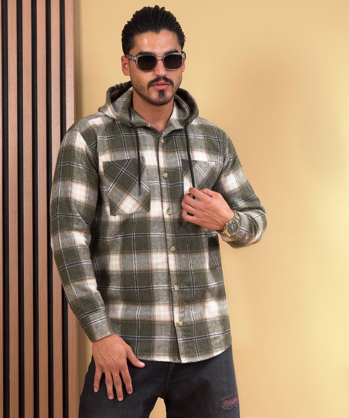 پیراهن پشمی ضخیم دوجیب چهارخانه کلاهدار