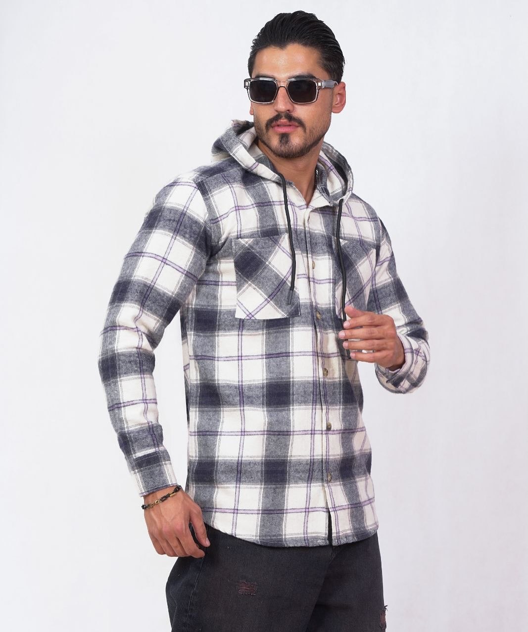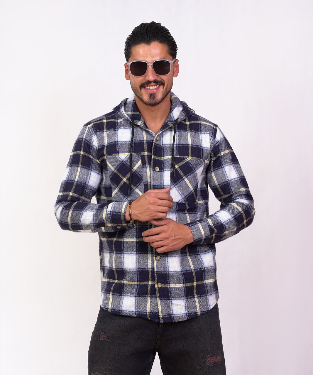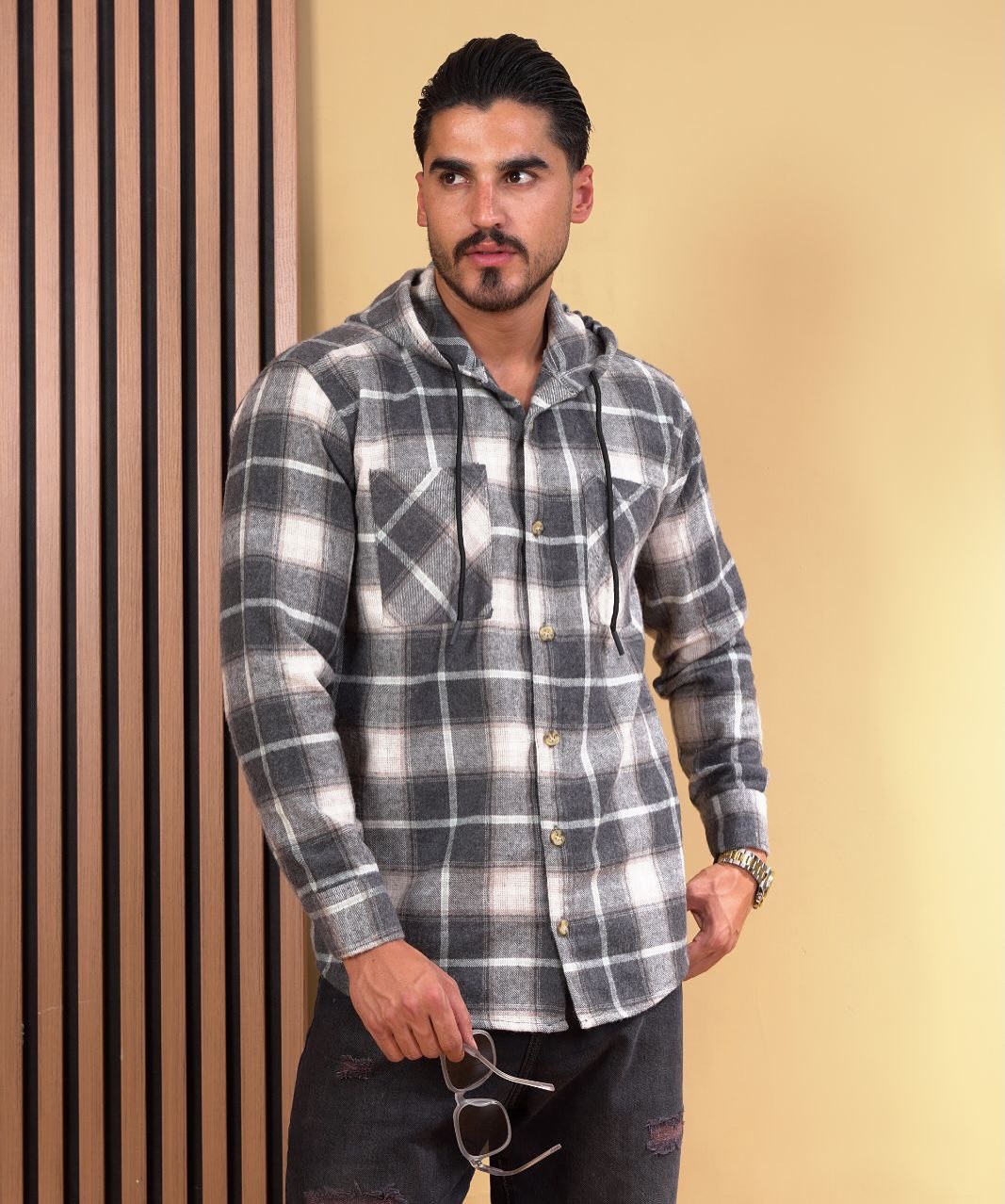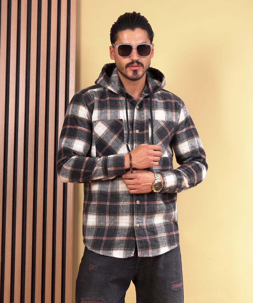 پیراهن پشمی ضخیم دوجیب چهارخانه کلاهدار